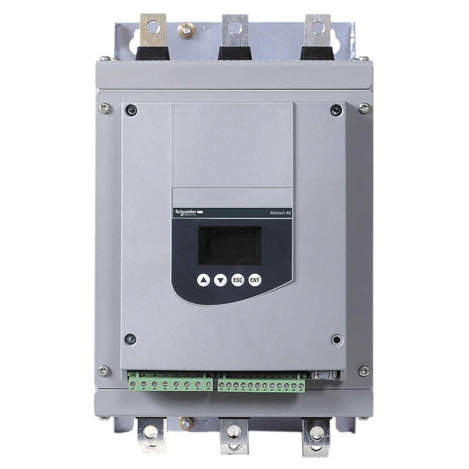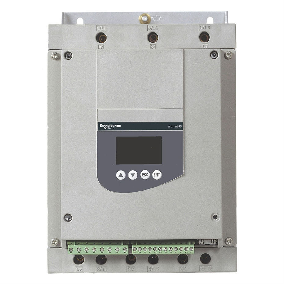 施耐德ATS48软启动器是一种高性能的软启动器,主要用于三相鼠笼式异步电机的力矩控制软启动和软停机。它由六个晶闸管组成,适用于电流范围在17至1200A之间的电机,功率范围为4至1200kW。
